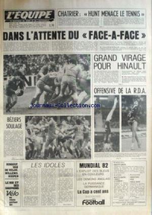 Descriptions EQUIPE (L') [No 10877] du 05/05/1981 - CHATRIER - HUNT MENACE LE TENNIS - DANS L'ATTENTE DU FACE-A-FACE - GRANDE VIRAGE POUR HINAULT - OFFENSIVE DE LA R.D.A - BEZIERS SOULAGE - BASKET - ESCRIME - BRIGITTE GAUDIN - ATHLETISME - PASCAL BARRE. livre