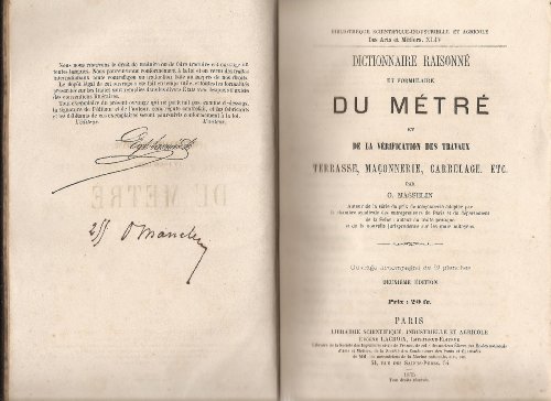 Descriptions Dictionnaire raisonné et formulaire du métré et de la vérification des travaux de terrasse, maçonnerie et carrelage, par O. Masselin livre