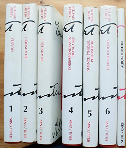 Textes choisis et présentés par françoise Balibar, Olivier Darrigol et Bruno Jech. Traduits de l'allemand par Françoise Balibar, Eduardo Costadura, Bruno Jech, Jean-Philippe Mathieu, Michel Netzer, Dominique Pradelle et le groupe de traduction de l'E.N.S. Fontenay / Saint-Cloud. Comprenant les tomes 1 à 6 : Quanta, mécanique statistique et physique quantique / Relativités I, relativité restreinte et générale / Relativités II, relativité générale, cosmologie et théories unitaires / Correspondances françaises / Science, éthique, philosophie / Ecrits politiques. Le septième volume présente une charmante biographie de jeunesse d'Einstein, par sa soeur Maja, qui ouvre cet album qui comprend également une chronologie de la vie d'Einstein. .