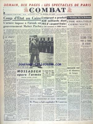 COUP D'ETAT AU CAIRE - L'ARMEE IMPOSE A FAROUK UN GOUVERNEMENT MAHER PACHA - LA REPUBLIQUE CHEZ LES BRAHMANES - L'INDE SERA-T-ELLE COMMUNISTE PAR CHOISY - LES JEUX OLYMPIQUES - MOSSADEGH EPURE L'ARMEE - GHAVAM ARRETE - SOUS LA PROTECTION DU TANK BIR-HAKEIM - PINAY A FAIT CAPITULER LAURENS - MASSACRE VIET A 65 KM DE SAIGON .