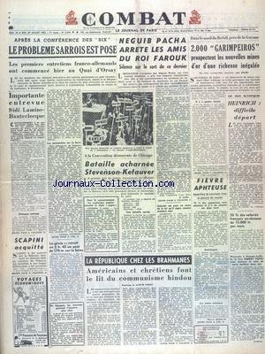 APRES LA CONFERENCE DES 6 - LE PROBLEME SARROIS EST POSE - IMPORTE ENTREVUE SIDI LAMINE-HAUTECLOCQUE - NEGUIB PACHA ARRETE LES AMIS DU ROI FAROUK - DANS LE NORD DU BRESIL - PRES DE LA GUYANE - 2000 GARIMPEIROS PROSPECTENT LES NOUVELLES MINES D'OR D'UNE RICHESSE INEGALEE - LES JEUX OLYMPIQUES ET HEINRICH - CHICAGO - BATAILLE ACHARNEE STEVENSON - KEFAUVER - LA REPUBLIQUE CHEZ LES BRAHMANES PAR CHOISY - SCAPINI ACQUITTE .