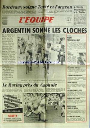 Descriptions EQUIPE (L') [No 12736] du 20/04/1987 - LEIPZIG - BORDEAUX - TOURE ET FARGERON - ARGENTIN SONNE LES CLOCHES- LE RACING PRES DU CAPITOLE - FOOT - NIORT - BOXE - CHAVEZ - GOLF - BALLESTEROS - ESCRIME - BASKEY - TENNIS - MONTE-CARLO - MOTO - SARRON - BATEAUX - MONNET- PEYRON AUTO. Télécharger