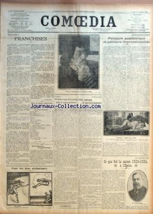Descriptions COMOEDIA [No 4224] du 14/07/1924 - POINTES SECHES - FRANCHISES PAR UN PROVINCIAL - POUR UN ARTISTE MALHEUREUX - GARDERONS-NOUS LE PALAIS FARNESE ? - POUR LES JEUX OLYMPIQUES - N L'ODEON - M. GEMIER NOUS DIT SES PROJETS POUR LA SAISON PROCHAINE PAR MAX FRANTEL - LE QUATORZE JUILLET - FETE NATIONALE ET SPECTACLE POPULAIRE PAR L. H. - LES MATINEES GRATUITES - LA VIE ARTISTIQUE A LONDRES - PEINTURE ACADEMIQUE ET PEINTURE IMPRESSIONNISTE PAR L. BORGEX - LE BILAN D'UNE SAISON - CE QUE FUT PDF